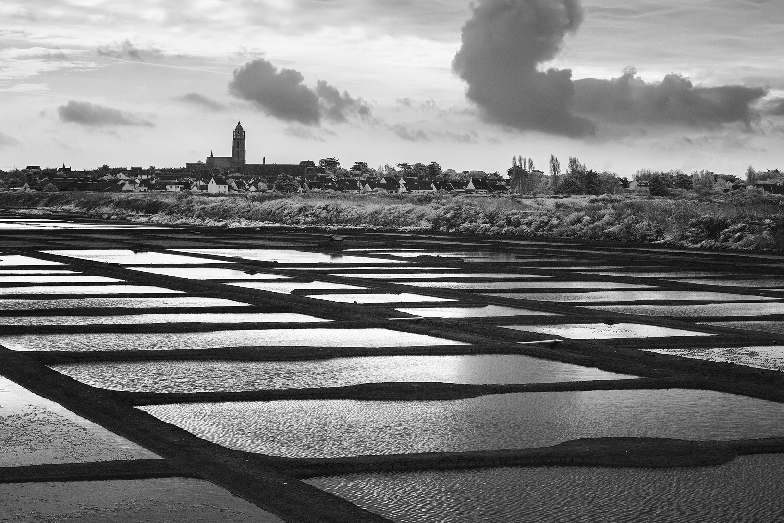 Posté(e) 27 octobre 20159 a comment_64080 Bonsoir à tous,Comme la semaine dernière, je vous propose une photo prise durant le week-end, cette fois-ci dans les marais salants au sud-ouest de Guérande. Une photo prise avec des moyens simples donc (sans filtre) sans idée particulière derrière la tête à la prise de vue, si ce n'est présenter les marais avec un arrière-plan un minimum intéressant (ici la ville de Batz-sur-Mer).Au niveau du traitement j'ai opté pour un noir et blanc très contrasté au niveau du marais pour jouer sur le côté graphique de ces carrés d'eau.A vos avis.