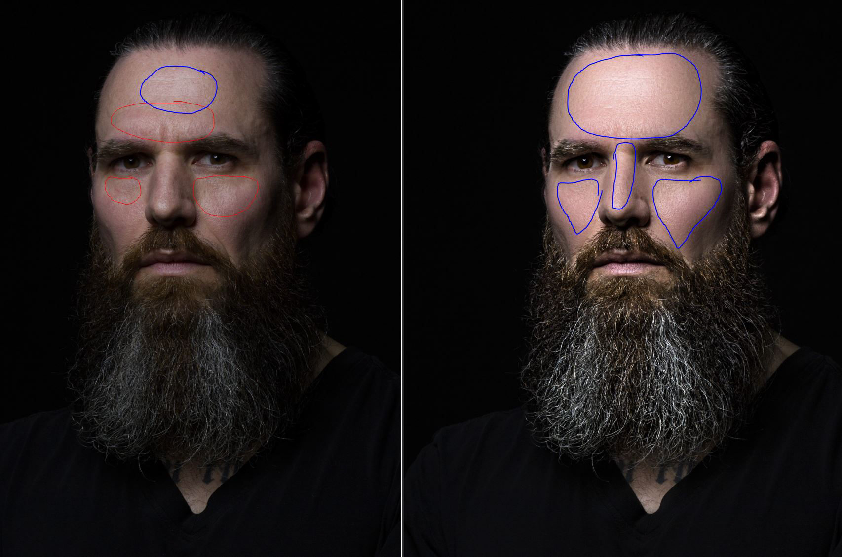 Et en bleu, j'ai essayé de figurer la zone de "quasi luminosité maximale". A gauche, elle n'est marquée qu'au front (sur l'impact principale du flash :-) ), à droite, ces zones sont étendues de manière plus importantes.  C'est ça que j'appelle l'applatissement : le fait que la quasi même luminosité soit sur une surface plus importante signifie pour mon oeil/cerveau que cette surface est plate. Je ressent plus le relief, et la rondeur du visage, sur la photo originale.