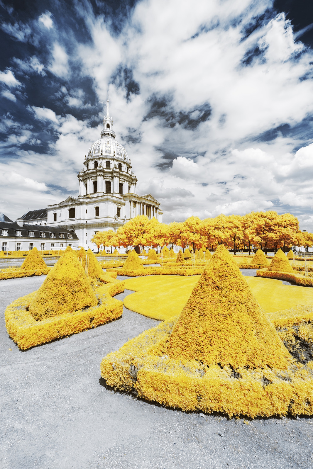 Posté(e) 8 juillet 20169 a comment_74518 Bonjour à tous! Le beau temps semble enfin vouloir durer plus de quelques heures, ce qui m'a permis de ressortit mon 6D défiltré et de me remettre à l'infrarouge couleur, ici à 665nm. Le but est de donner un aspect doré aux feuilles des arbres. Contrairement au rendu blanc à 720nm, ici la gestion des couleurs est assez ardue : la saturation arrive vite, il faut savoir doser à la fois l'exposition, le contraste et la saturation des couleurs pour obtenir un rendu ni trop flashy, ni trop pastel. En plus de la saturation, la teinte a été inversée sélectivement pour supprimer la dominante bleue des nuages et des murs des Invalides. J'ai fait le tour je pense, la suite en cours