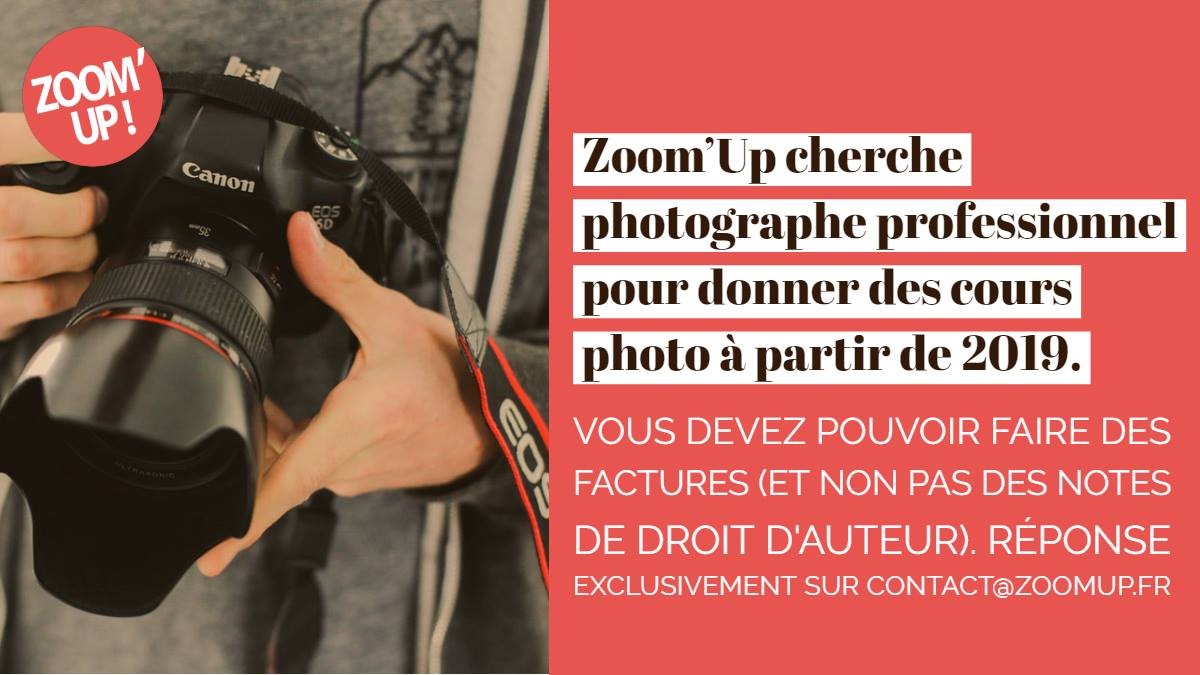 Posté(e) 21 décembre 20186 a comment_87388 Vu sur facebook, je sas pas si ça peut intéresser du monde par ici "Zoom’Up cherche photographe professionnel pour donner des cours photo à partir de 2019. Vous devez pouvoir faire des factures (et non pas des notes de droit d'auteur). Réponse exclusivement sur contact@zoomup.fr" https://www.zoomup.biz/