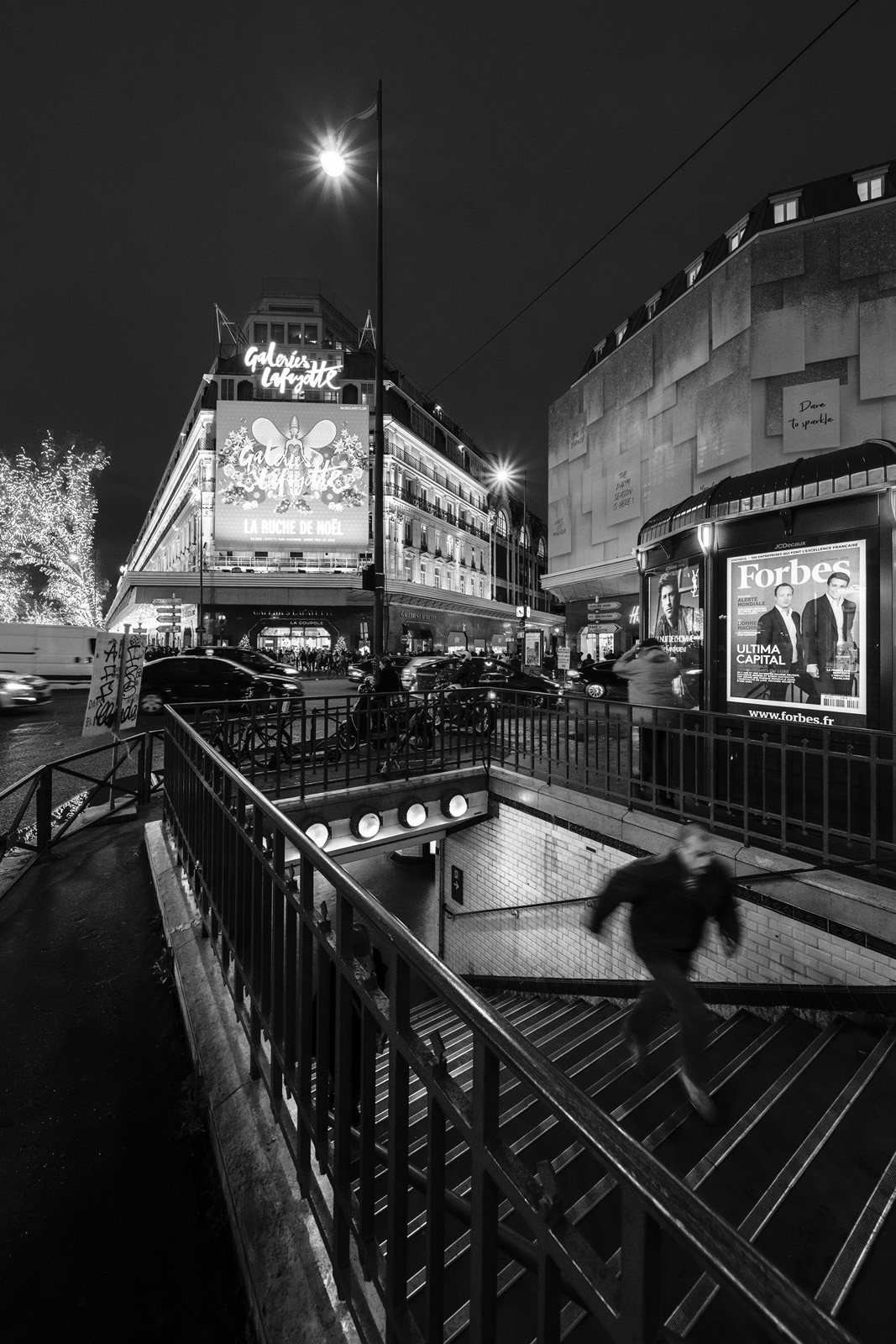 Posté(e) 27 novembre 20195 a comment_89365 En sortant des Galeries Lafayette, je me suis un peu attardé sur le boulevard en essayant de faire de la photo de rue, mais au 12mm ce n'est pas vraiment adapté... Du coup je me suis posté à la sortie d'une bouche de métro jusqu'à temps qu'une personne se décide à courir pour sortir.